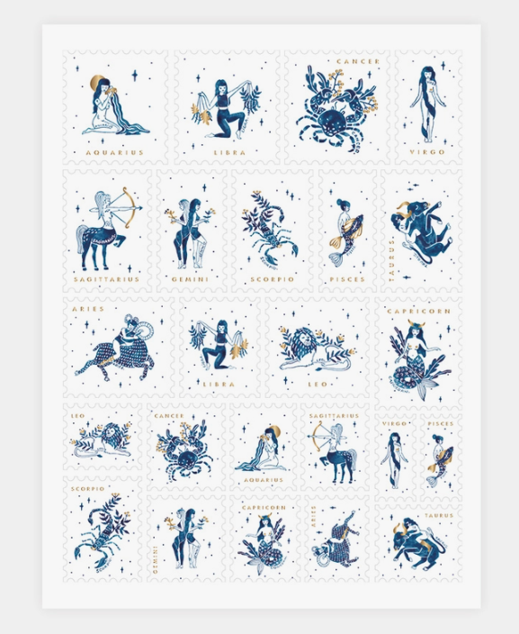 • Folha com 24 autocolantes de signos do zodíaco em azul, branco e dourado