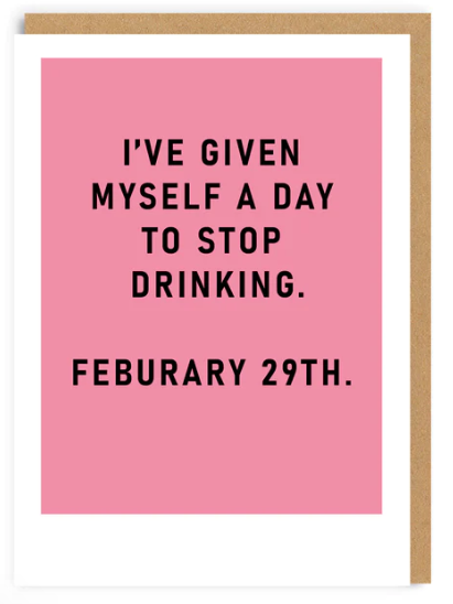 Send a message of sobriety with this fun and funny Stop Drinking 29th Feb greeting card! Show your loved one you care and make them smile with this whimsical card printed with black foil lettering.