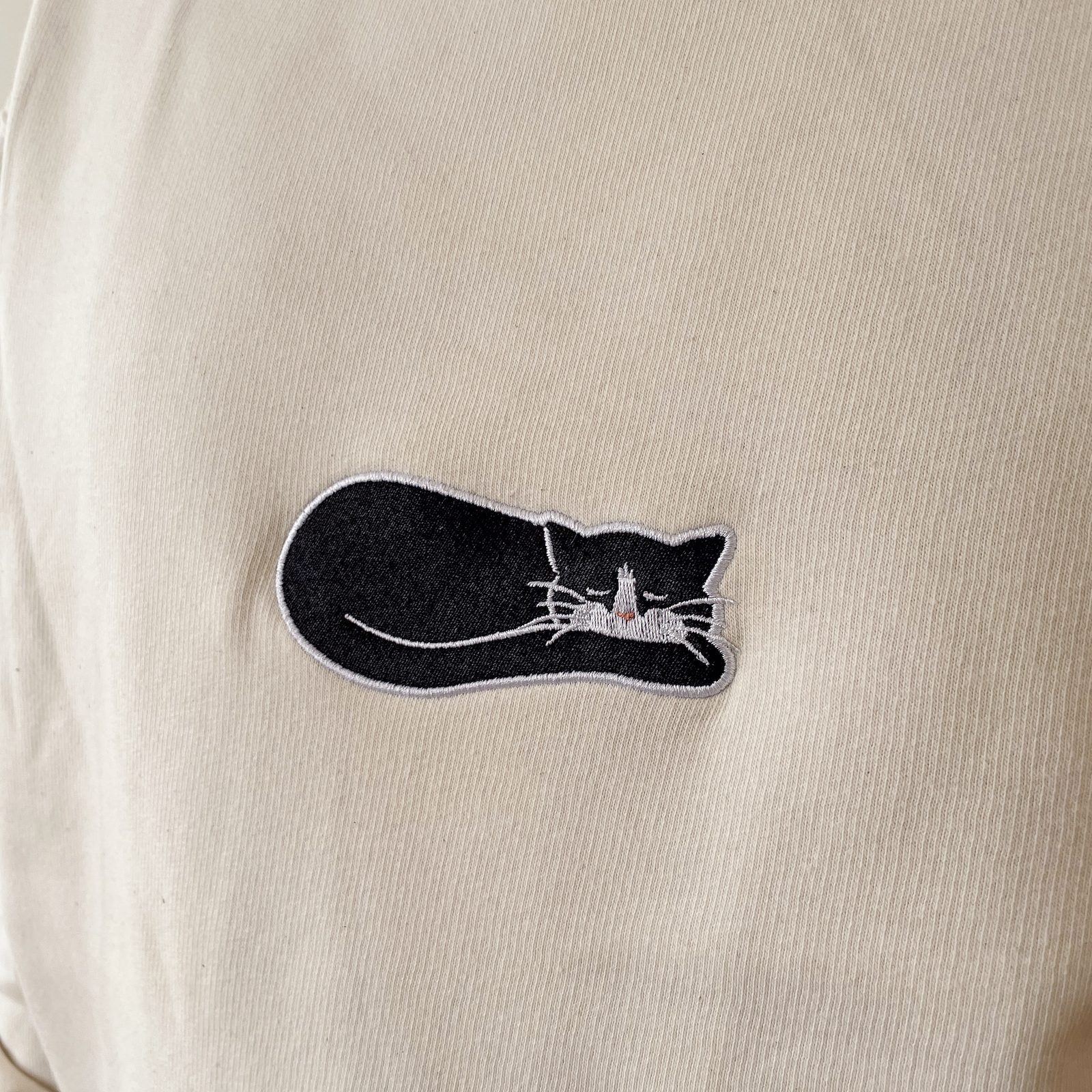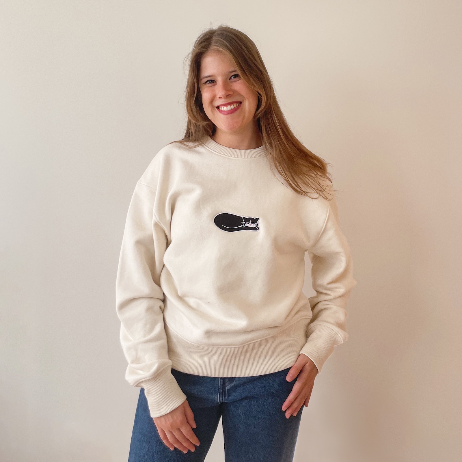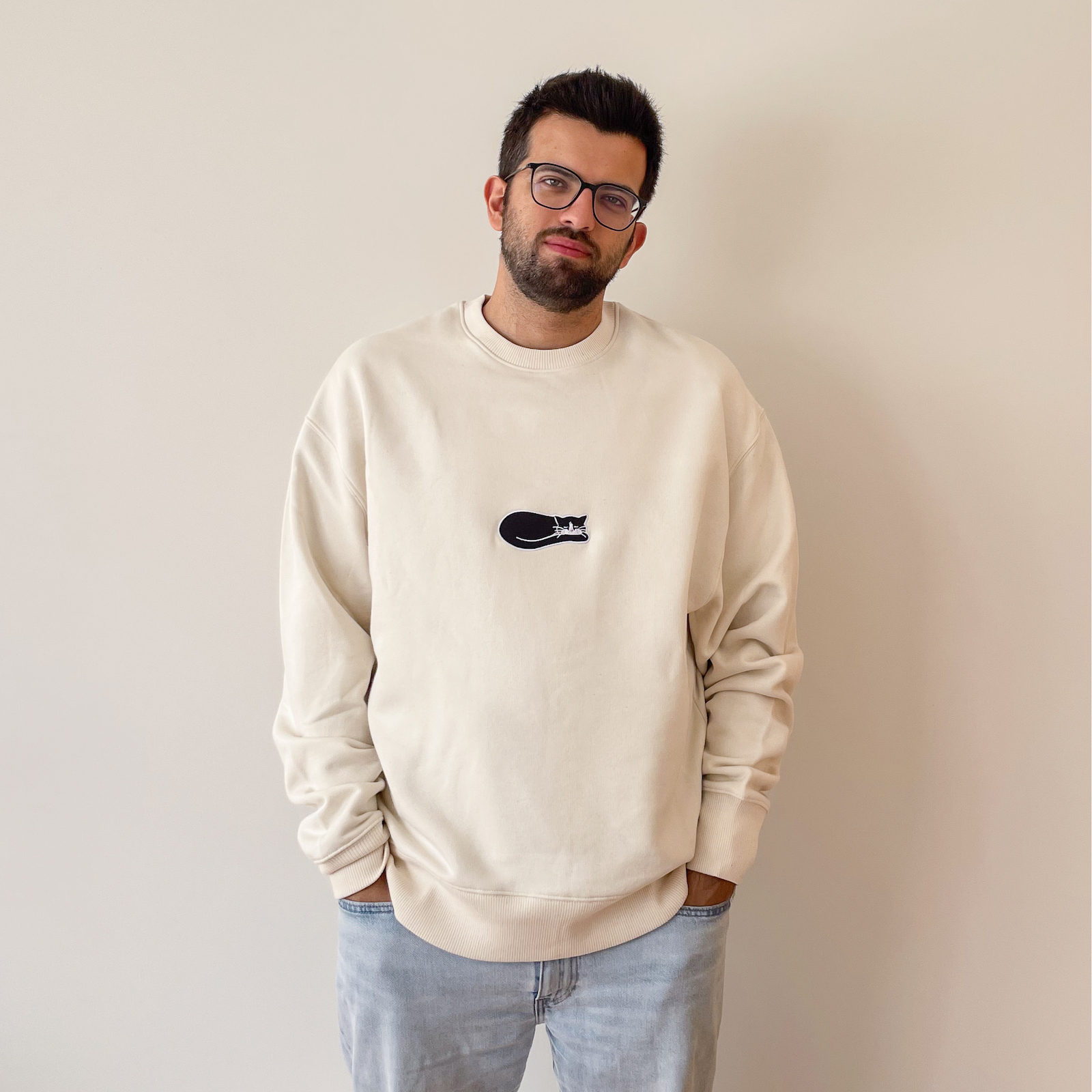 Camisola perfeita para as manhãs frias de inverno. Gatinho bordado à frente, frase “I wish I stayed in bed with my cat” impressa em serigrafia atrás. 85% algodão e 15% de poliéster reciclado. Cardada no interior. Modelo Unisexo.