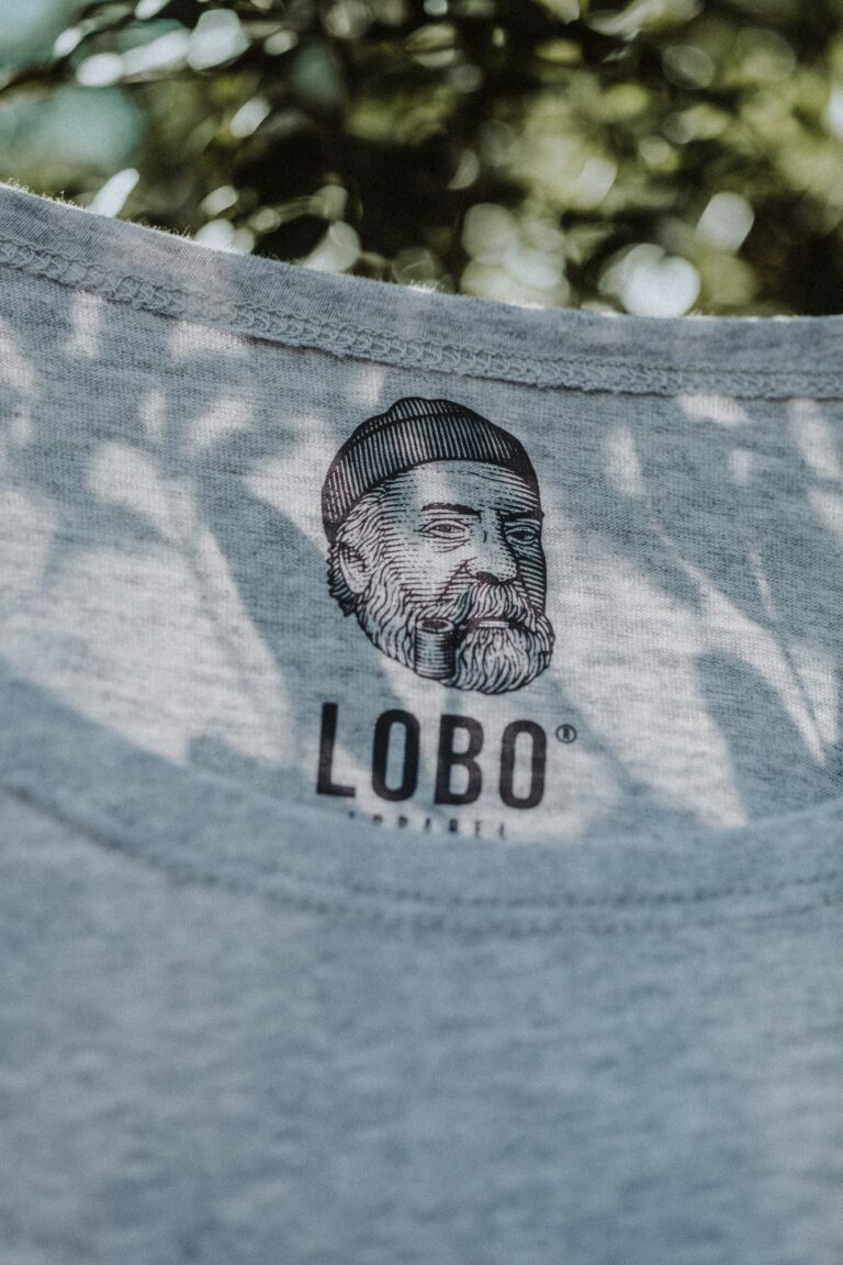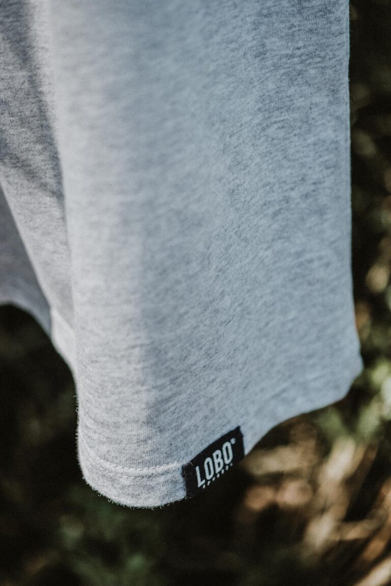 • Etiqueta interior de t-shirt cinza com logo e texto LOBO® SPELL