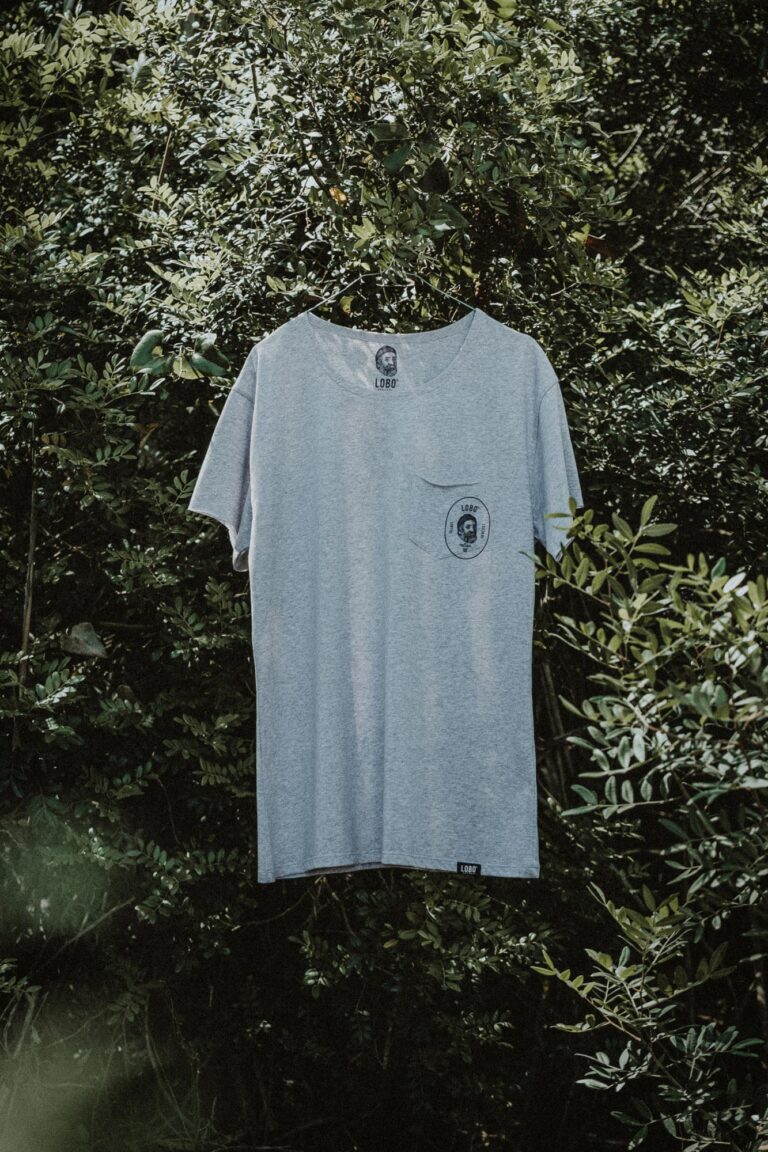 • Camisola cinzenta com ilustração preta e texto Lobo® Apparel pendurada em cabide com sombras de folhas