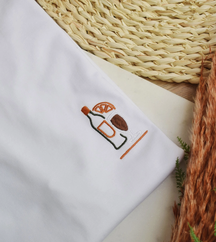 T-shirt bordada em algodão orgânico para os amantes do vinho, surf, sol e férias!