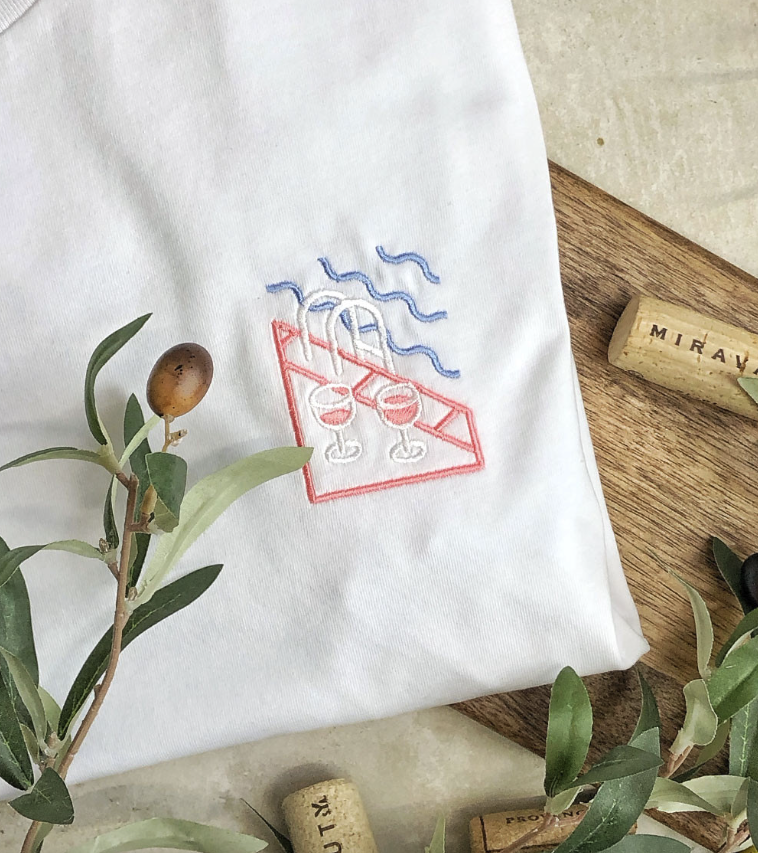T-shirt bordada em algodão orgânico para os amantes do vinho, surf, sol e férias!