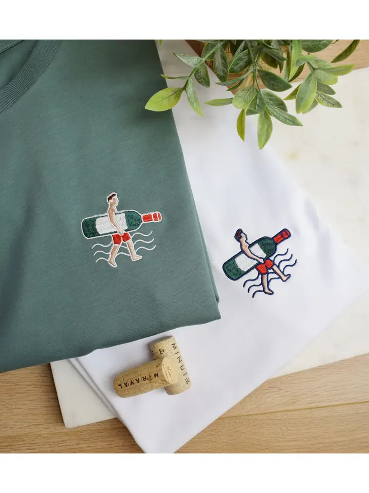 T-shirt bordada em algodão orgânico para os amantes do vinho, surf, sol e férias!