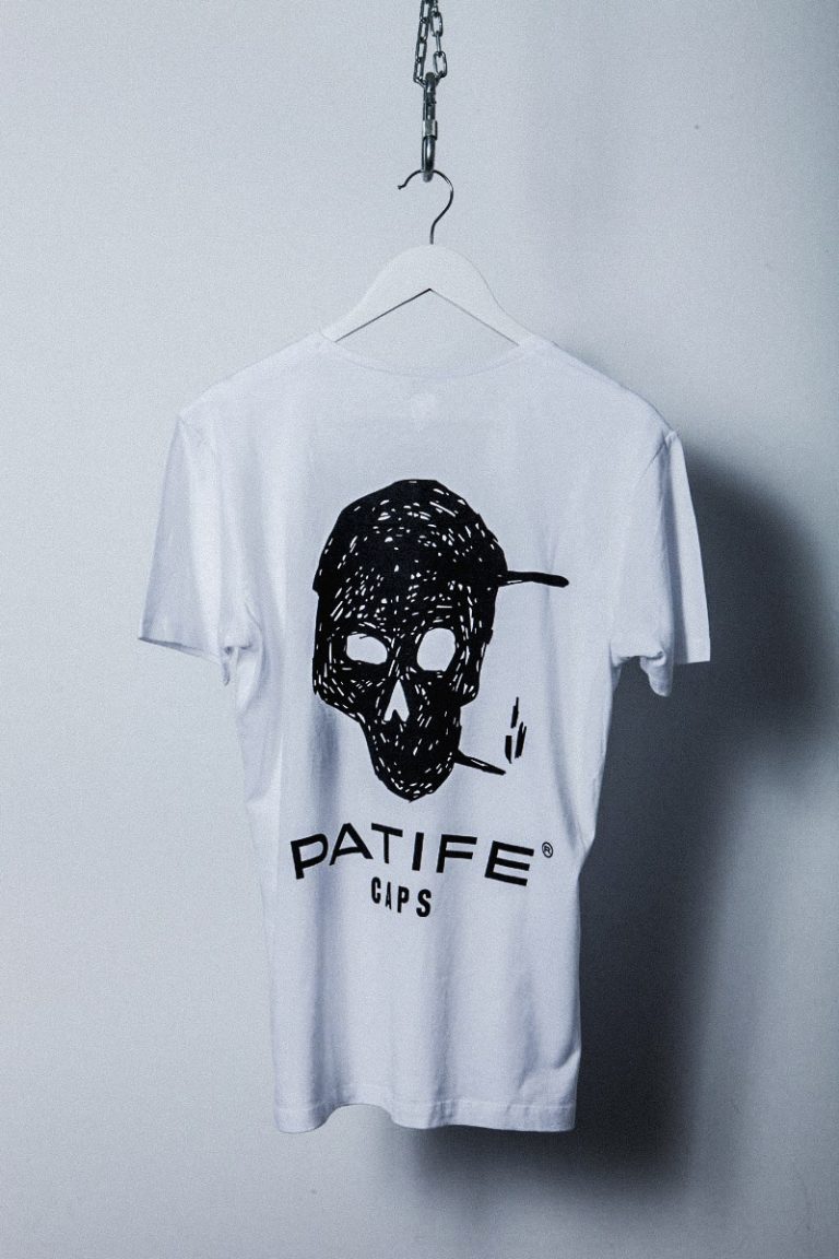 • T-shirt branca com estampa preta de crânio com boné e texto PATIFE CAPS pendurada