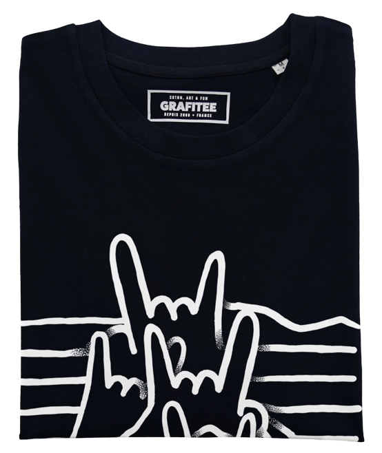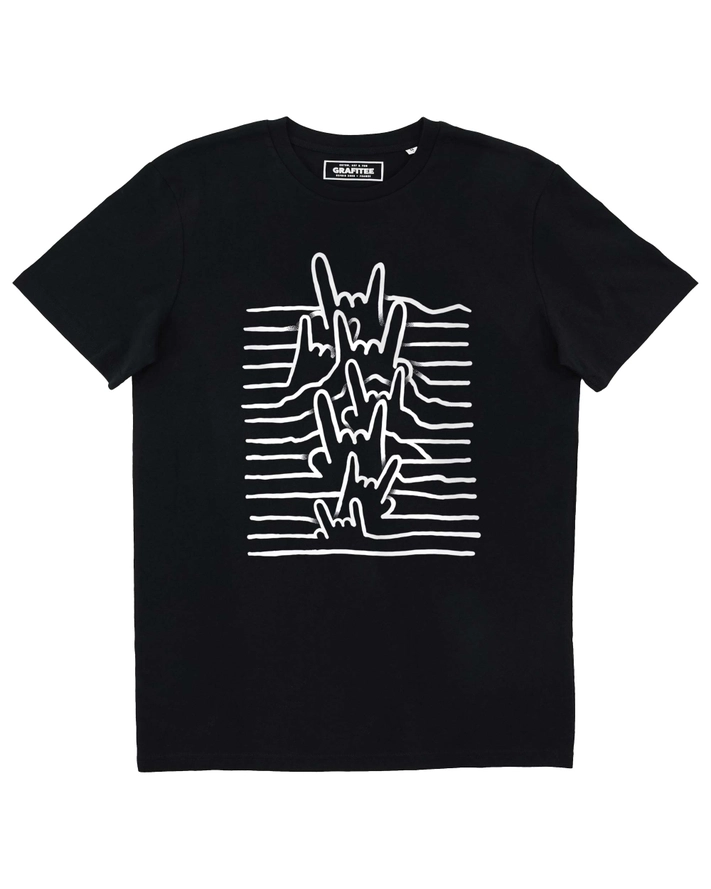 • T-shirt preta com estampado branco de mãos a fazer gesto de rock
