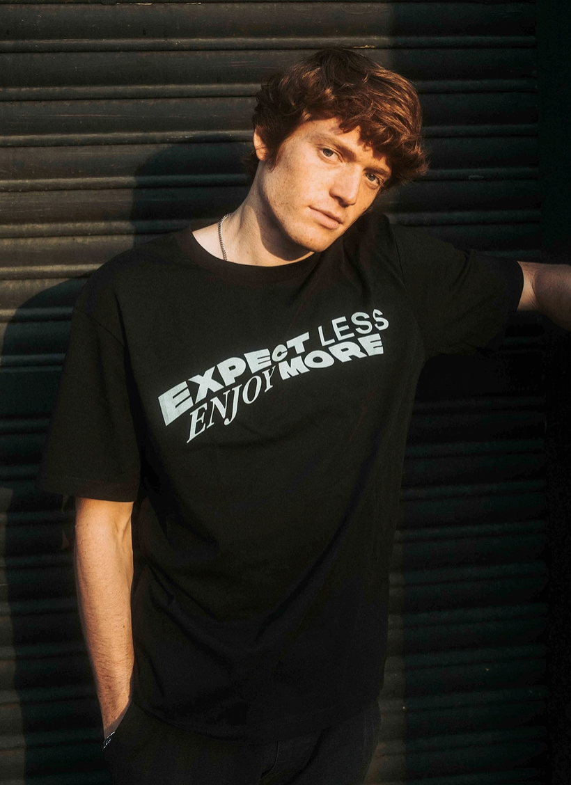Homem usando t-shirt preta com frases em branco 'EXPECT LESS ENJOY MORE'