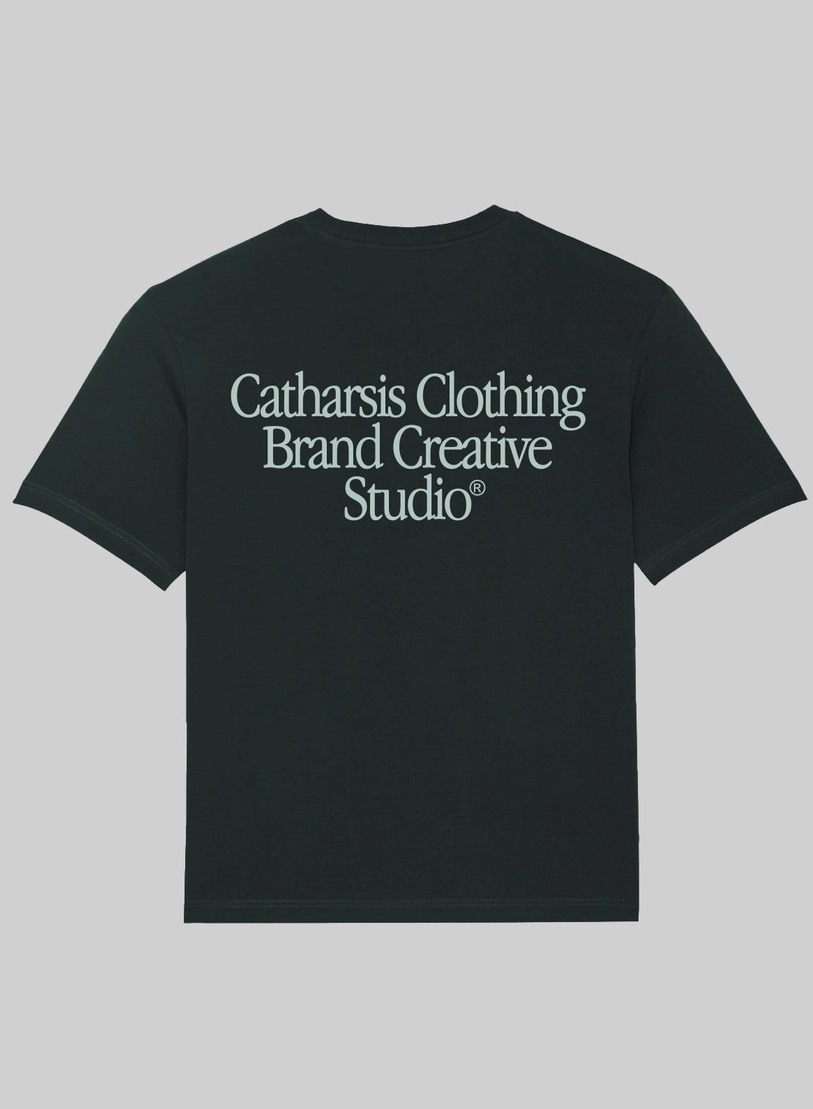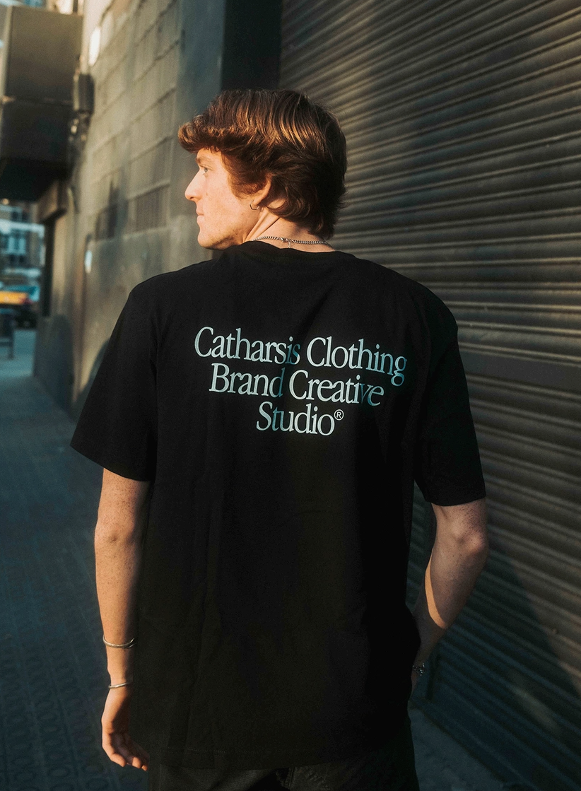 • Camiseta preta com texto 'Catharsis Clothing Brand Creative Studio®' nas costas, vista numa pessoa de costas em zona urbana.