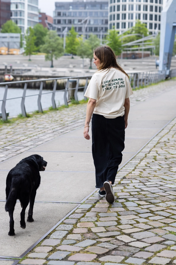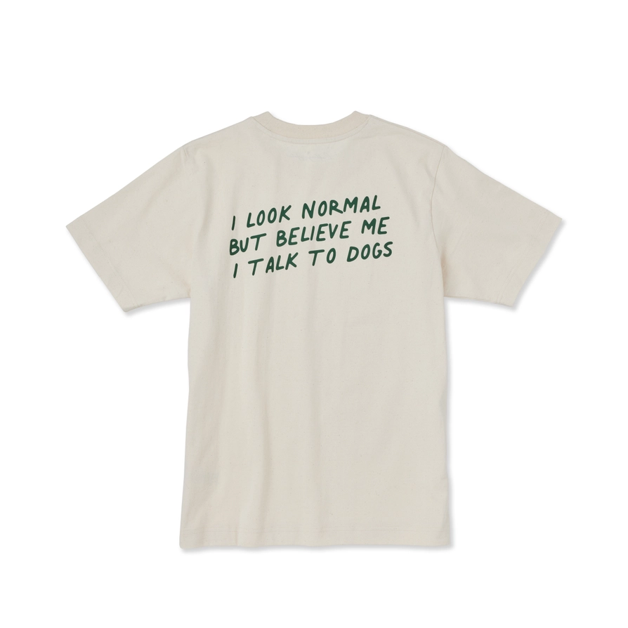• T-shirt bege com texto verde escuro 'I LOOK NORMAL BUT BELIEVE ME I TALK TO DOGS'