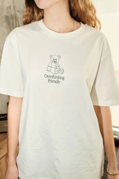 • T-shirt branca com desenho de ursinho e texto Overthinking Friendly