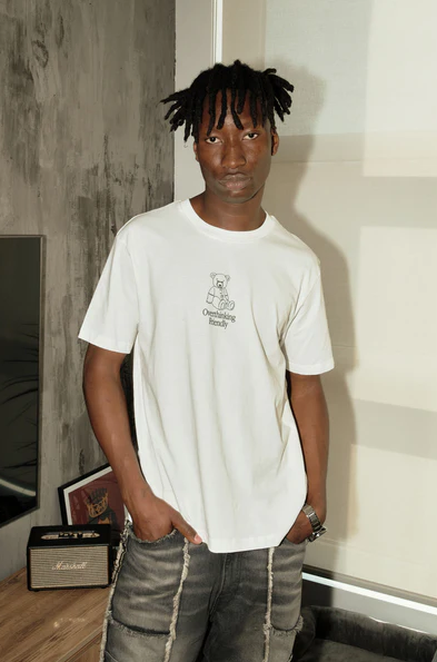 • Camiseta branca com estampa de urso e texto em preto, modelo masculino em ambiente interior