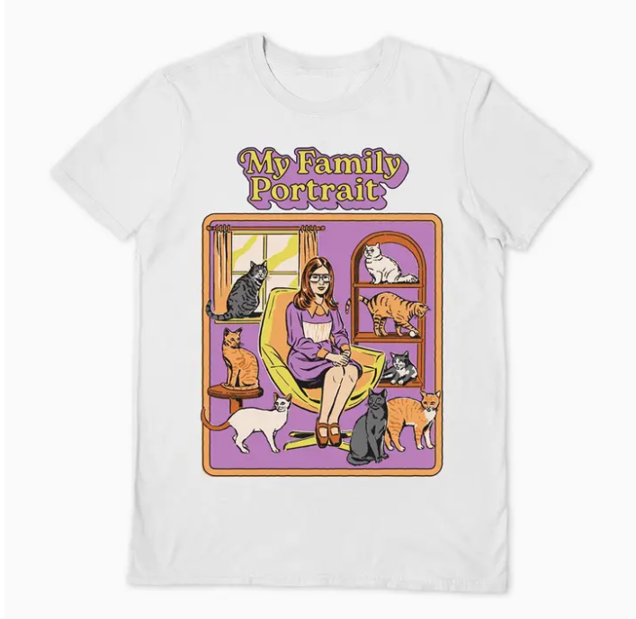 • Camiseta branca com estampa de mulher e gatos com texto My Family Portrait
