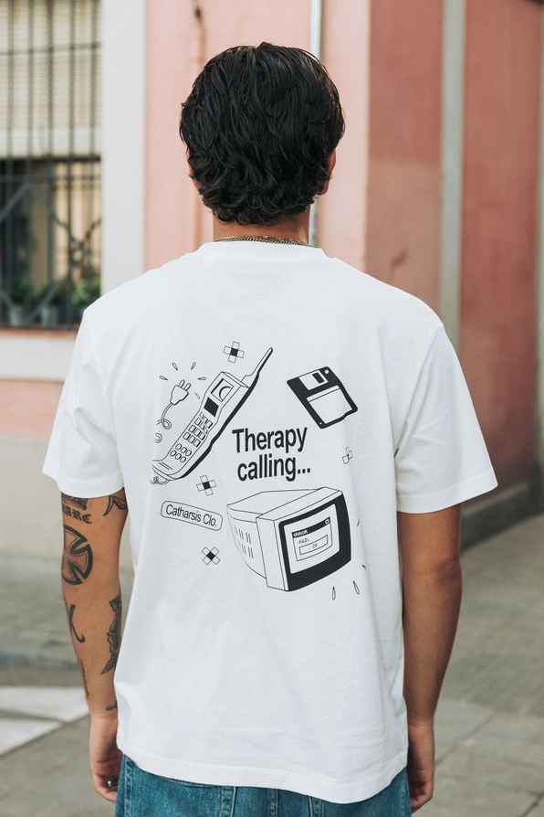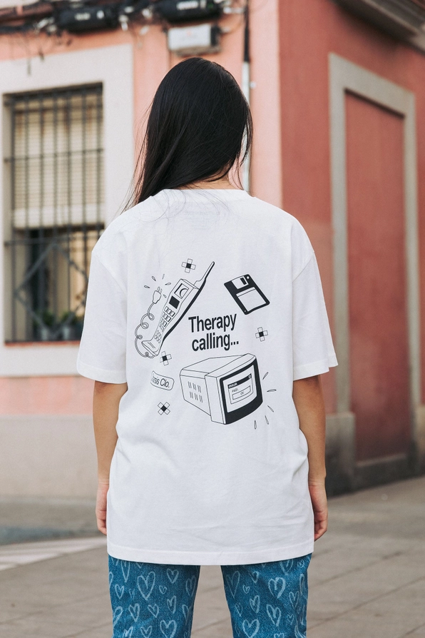 • T-shirt branca com estampa preta de aparelhos eletrónicos e texto 'Therapy calling...'. Pessoa de costas na rua com calças azuis de corações.