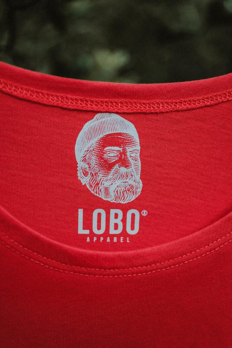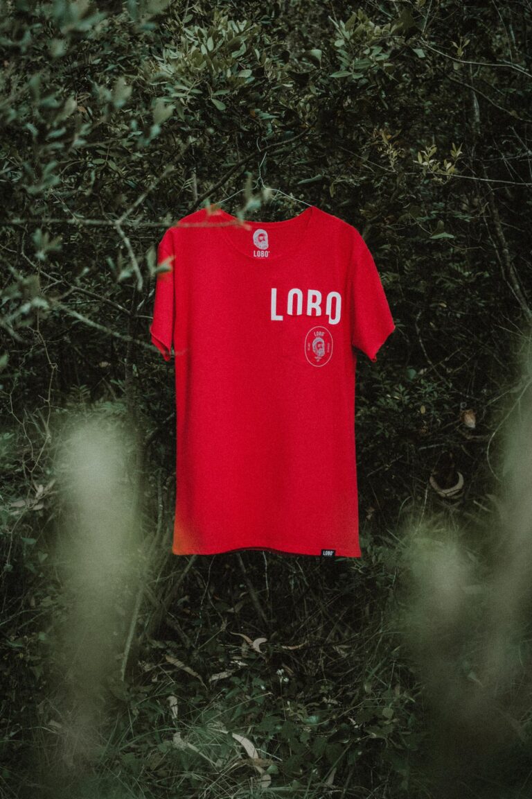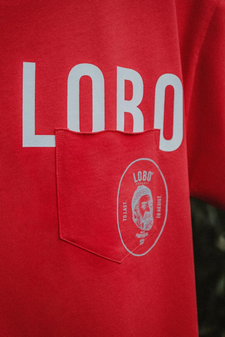 • Etiqueta de t-shirt vermelha com logotipo branco LOBO APPAREL