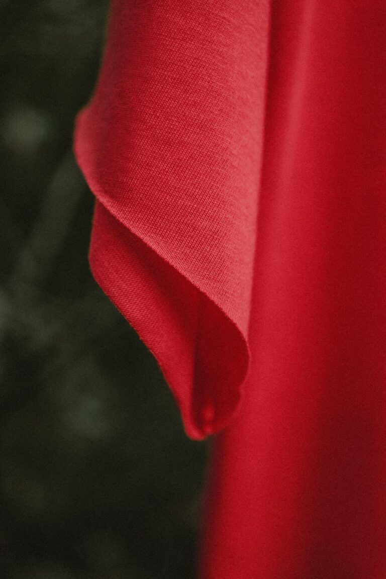 • Peça de vestuário vermelha com tecido macio, detalhe de manga
