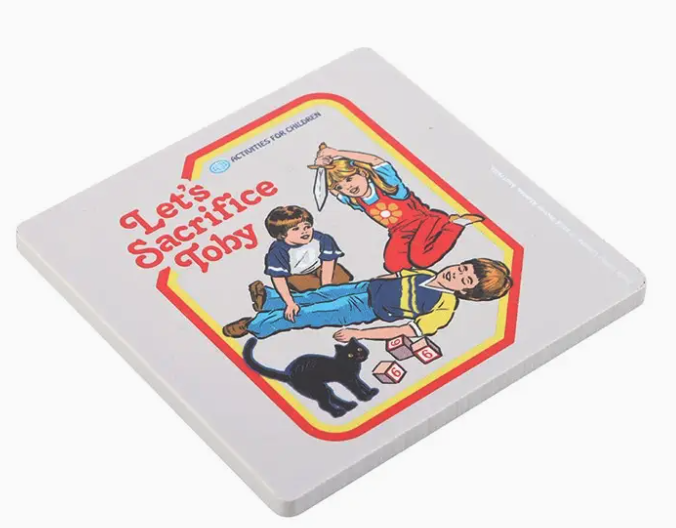 Etiqueta com ilustração de crianças, gato e texto Lets Sacrifice Toby