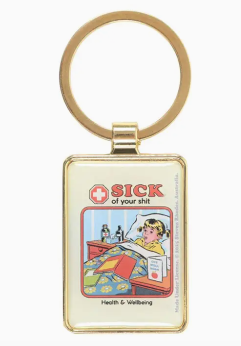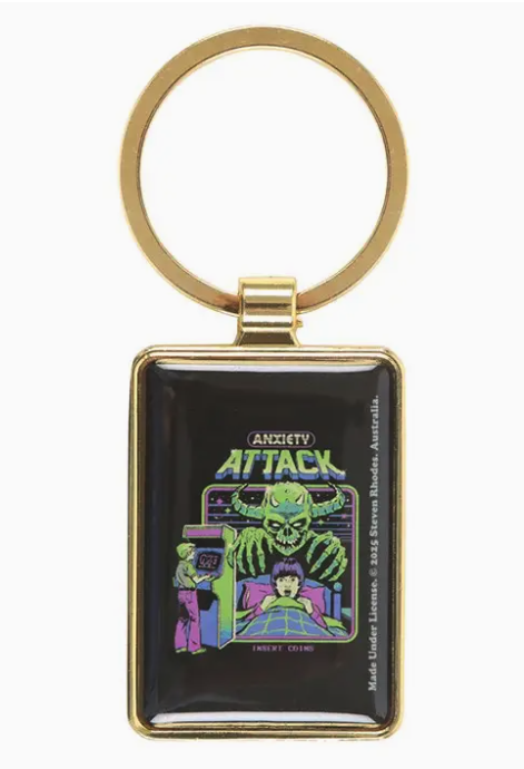 • Porta-chaves dourado com ilustração de mulher e malas e texto My Emotional Baggage.