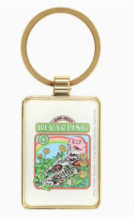 • Chaveiro dourado com ilustração sobre reciclagem e esqueleto em flores