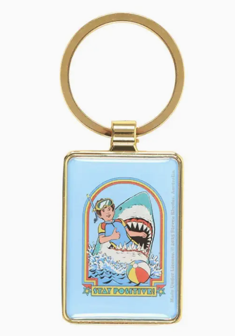 • Porta-chaves retangular dourado com imagem colorida e texto STAY POSITIVE!