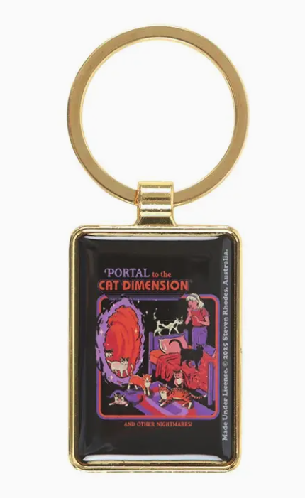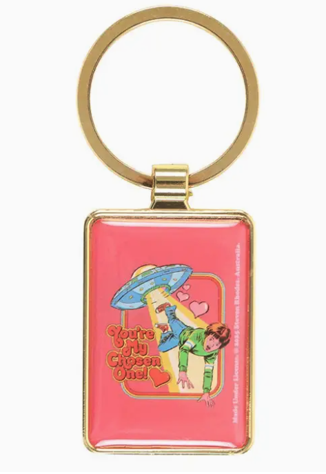 • Porta-chaves dourado com placa rosa e ilustração de criança abduzida por disco voador