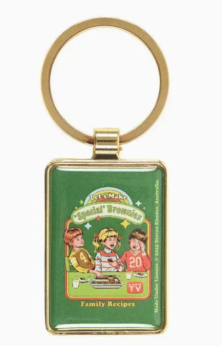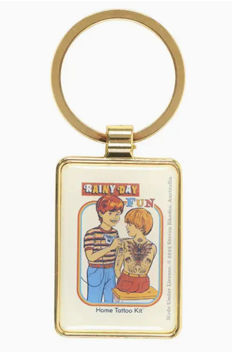 • Porta-chaves dourado com imagem de crianças e texto RAINY DAY FUN Home Tattoo Kit