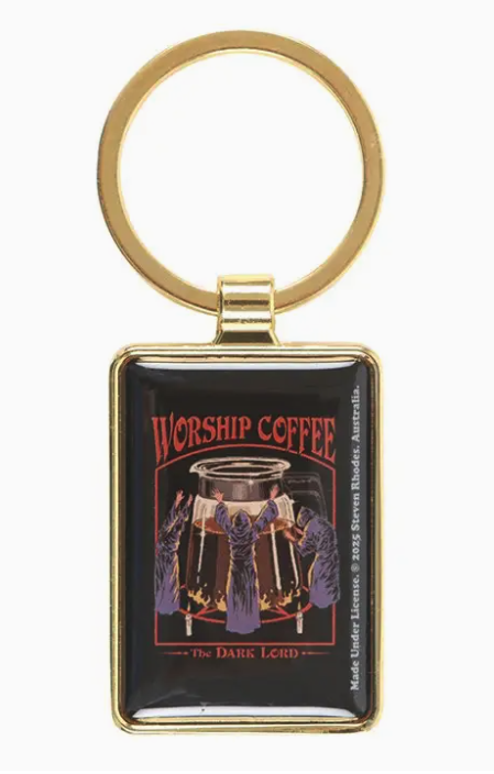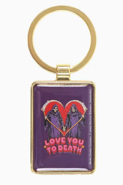 • Chaveiro dourado com imagem de duas figuras da morte num coração e texto LOVE YOU TO DEATH