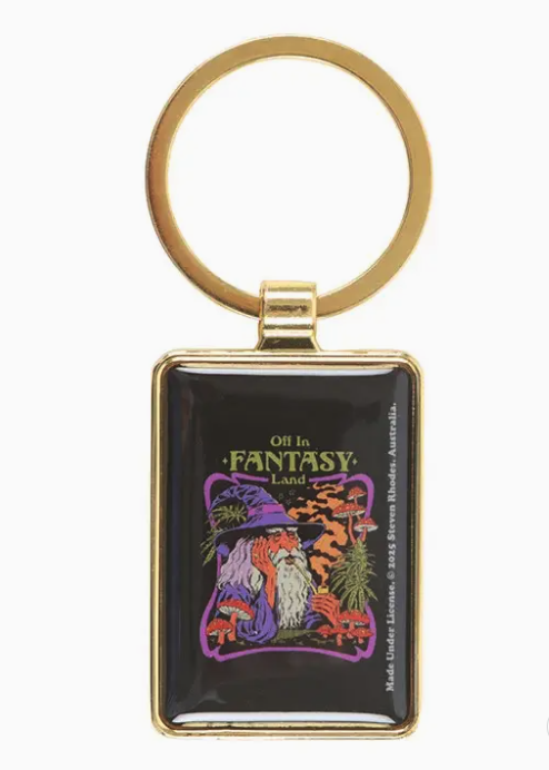 • Chaveiro dourado com imagem de mago, plantas e texto Off In FANTASY Land