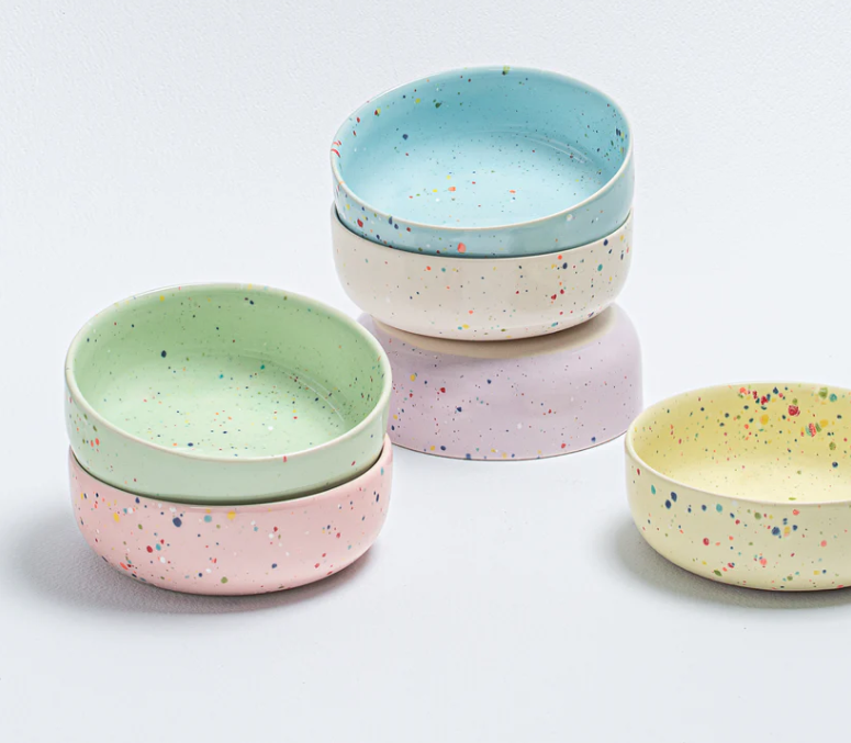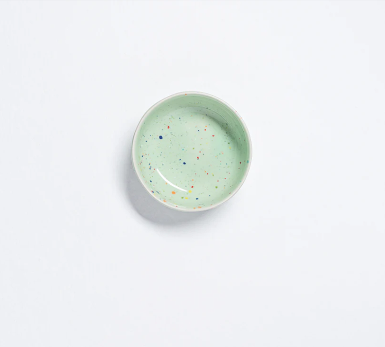 • Tigela verde claro com pintas coloridas sobre fundo branco