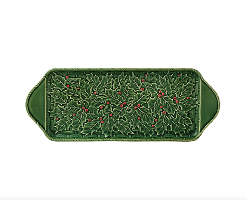 • Tabuleiro de cerâmica verde com desenho de folhas de azevinho e bagas vermelhas