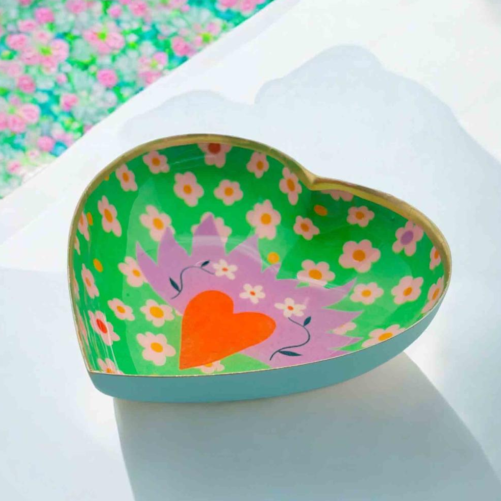 Aproveite todas as pequenas coisas que a vida lhe oferece – como esta encantadora taça em formato de coração – um lindo coração colorido espera por você em meio a um mar de flores vibrantes – oh, tão lindamente colorida! Guarde nela as suas joias ou simplesmente coloque-a sobre a mesa como objeto decorativo – ela trará um toque de cor e alegria ao seu dia a dia!