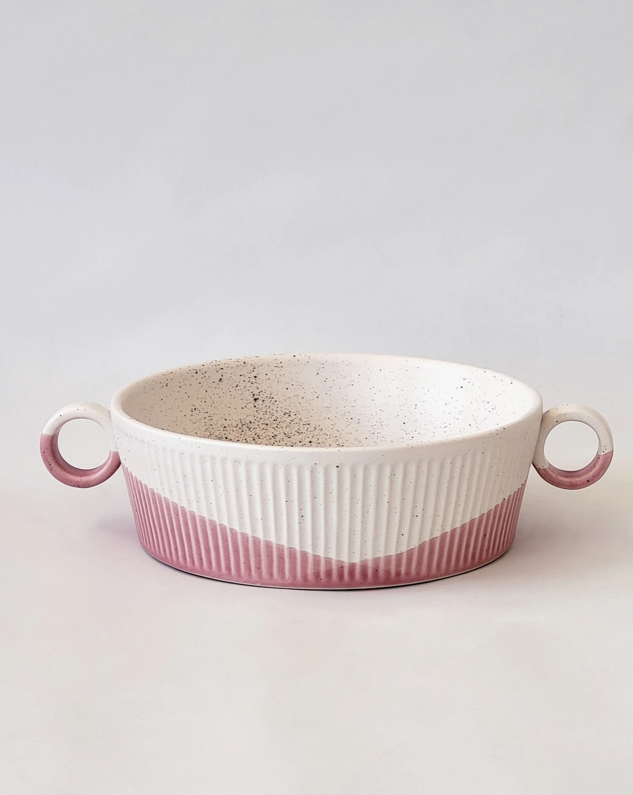 • Travessa de cerâmica branca com padrão rosa e alças circulares