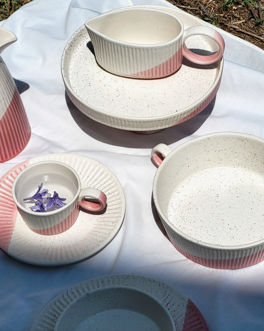 • Conjunto de loiça em cerâmica branca com pintinhas pretas e rosa claro