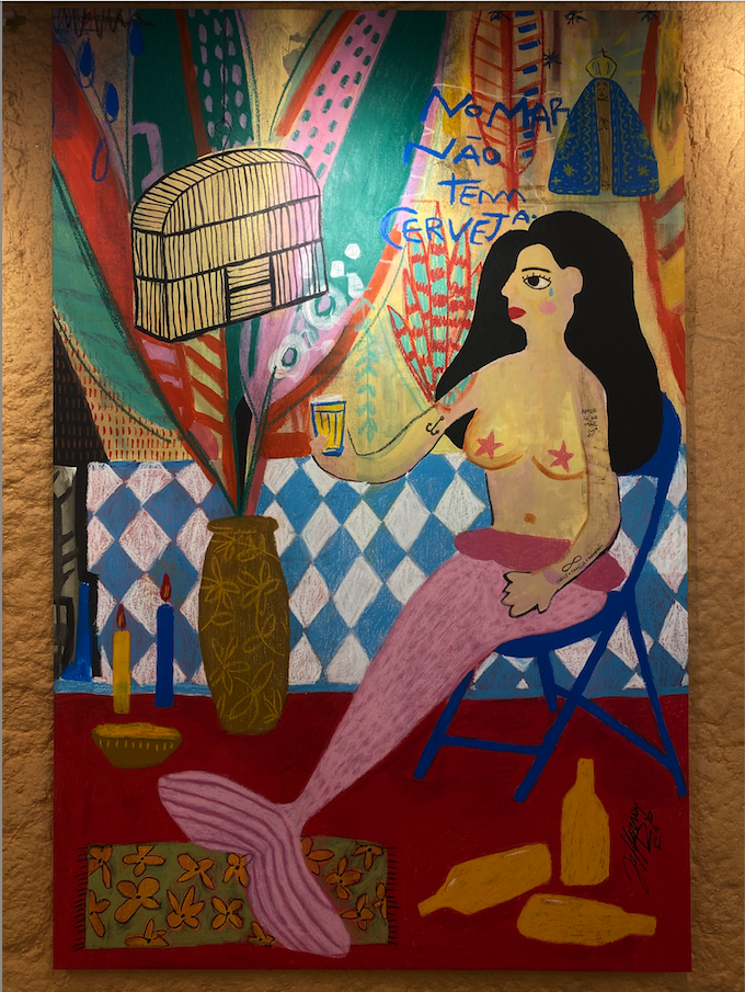 Pintura colorida de uma sereia segurando copo com bebida