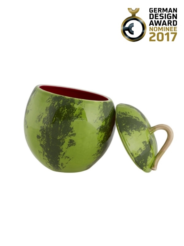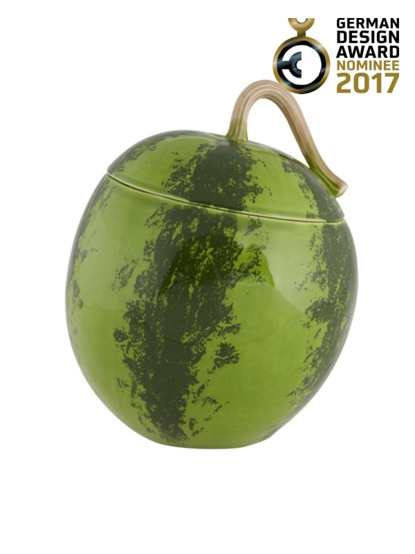 • Recipiente cerâmico formato melancia com tampa verde e manchas escuras
