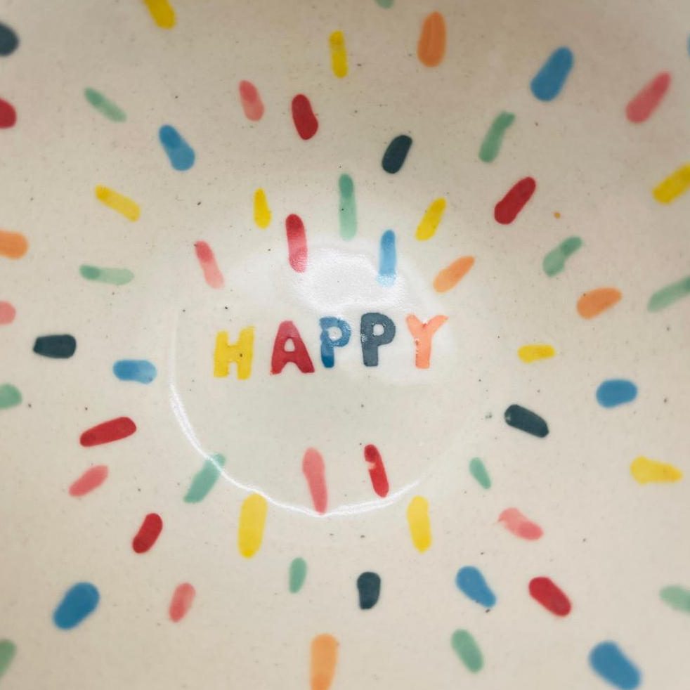 Esta tigela de cerâmica, pintada à mão com carinho, com a palavra FELIZ, é coberta por linhas minúsculas que circundam a palavra. Perfeita para uma deliciosa tigela de muesli, uma salada de frutas ou biscoitos saborosos. Esta tigela colorida é um presente maravilhoso para alguém especial.