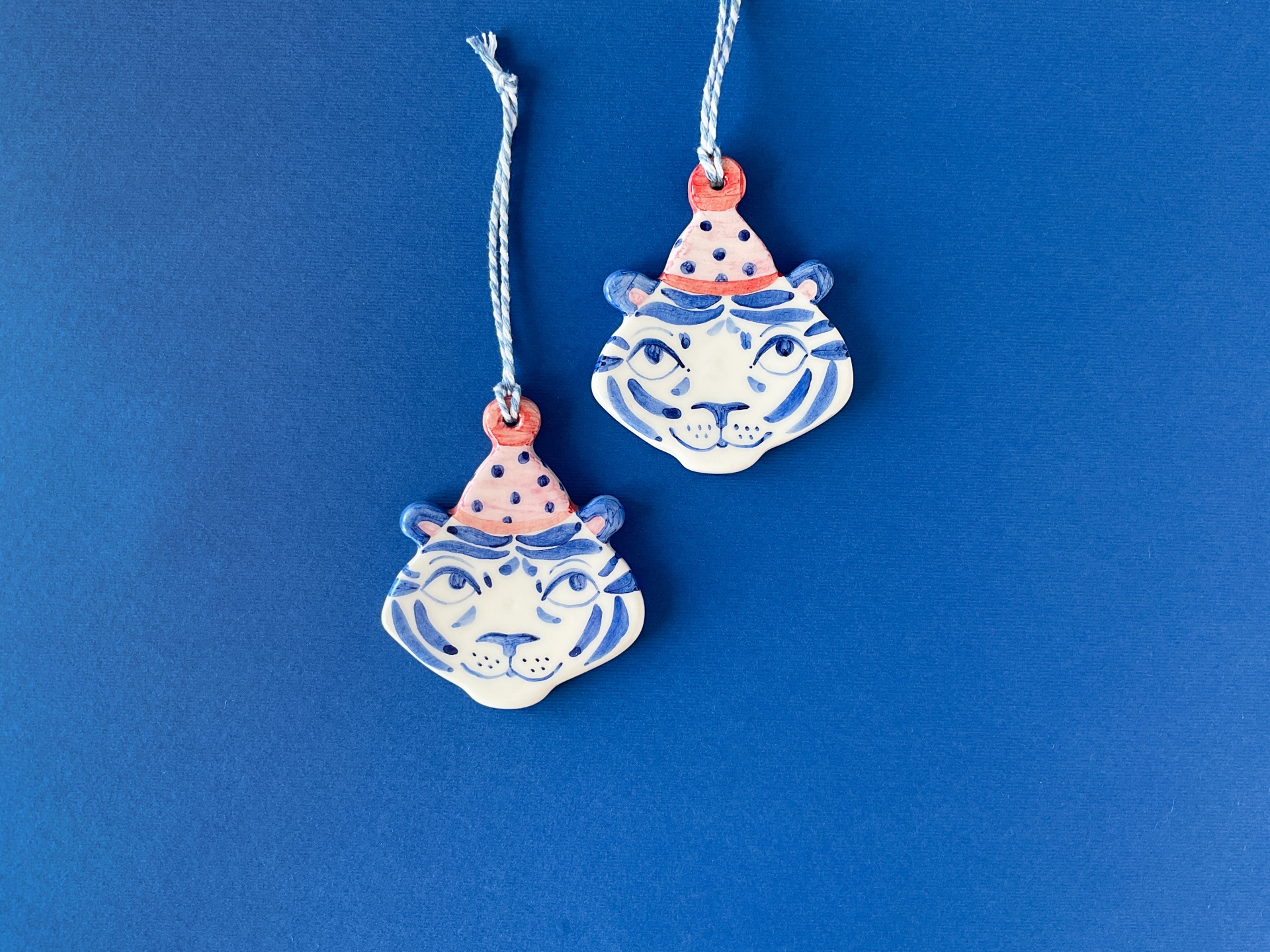 • Dois ornamentos em forma de cabeça de tigre com padrão azul e branco e chapéu rosa