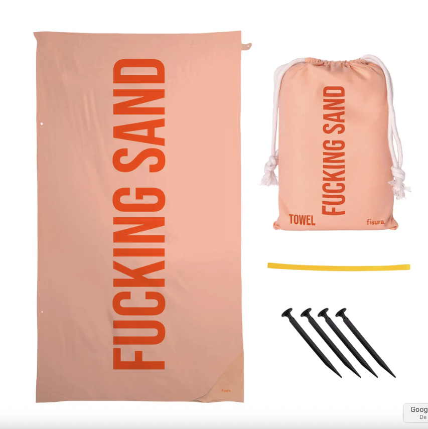 Toalha de praia salmão com texto grande laranja e saco de transporte com estacas pretas
