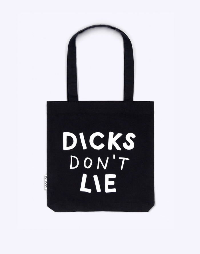 • Saco preto de tecido com texto branco 'DICKS DON'T LIE'