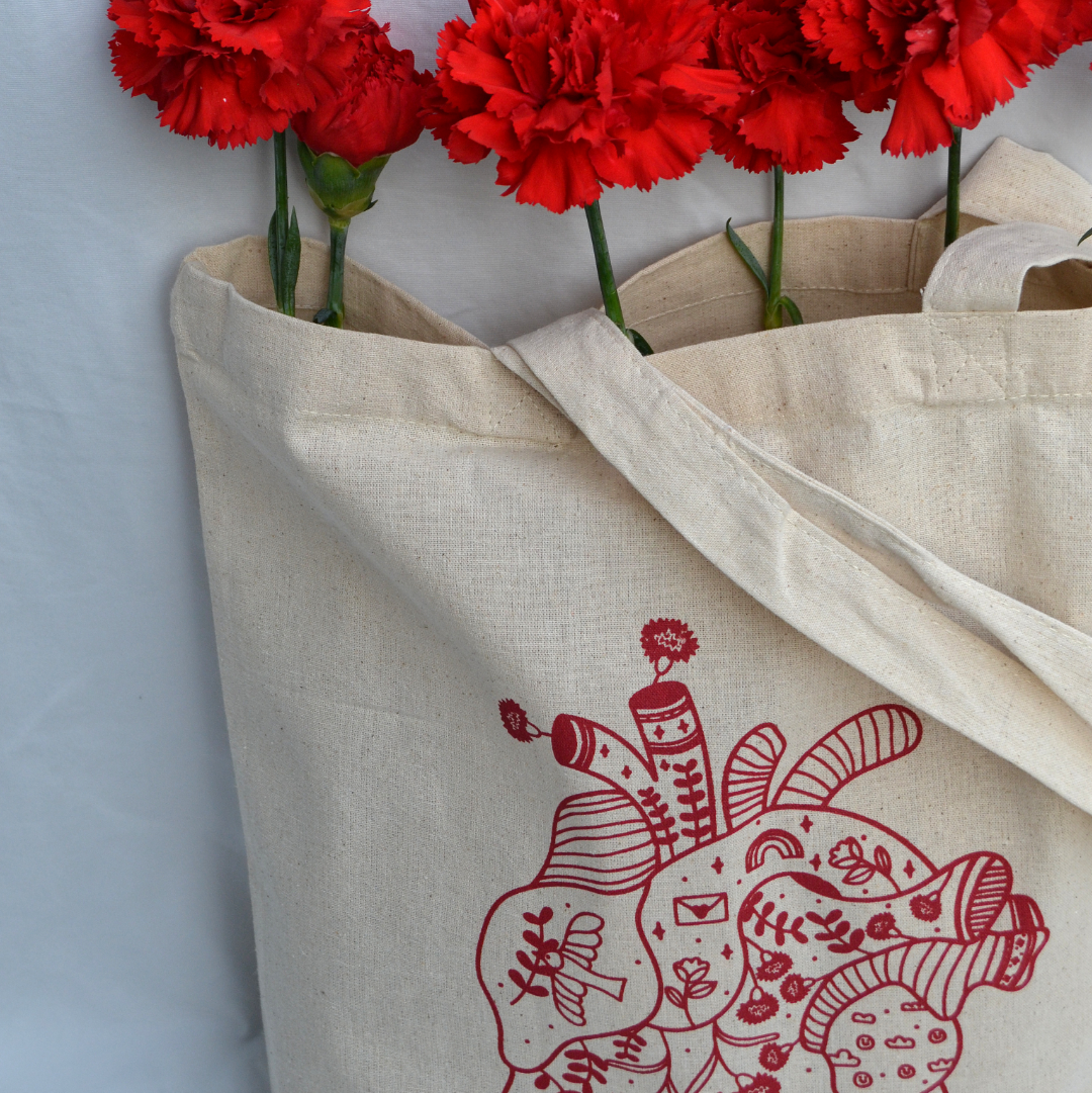 Saco de tecido bege com impressão vermelha de coração anatómico e cravos vermelhos.