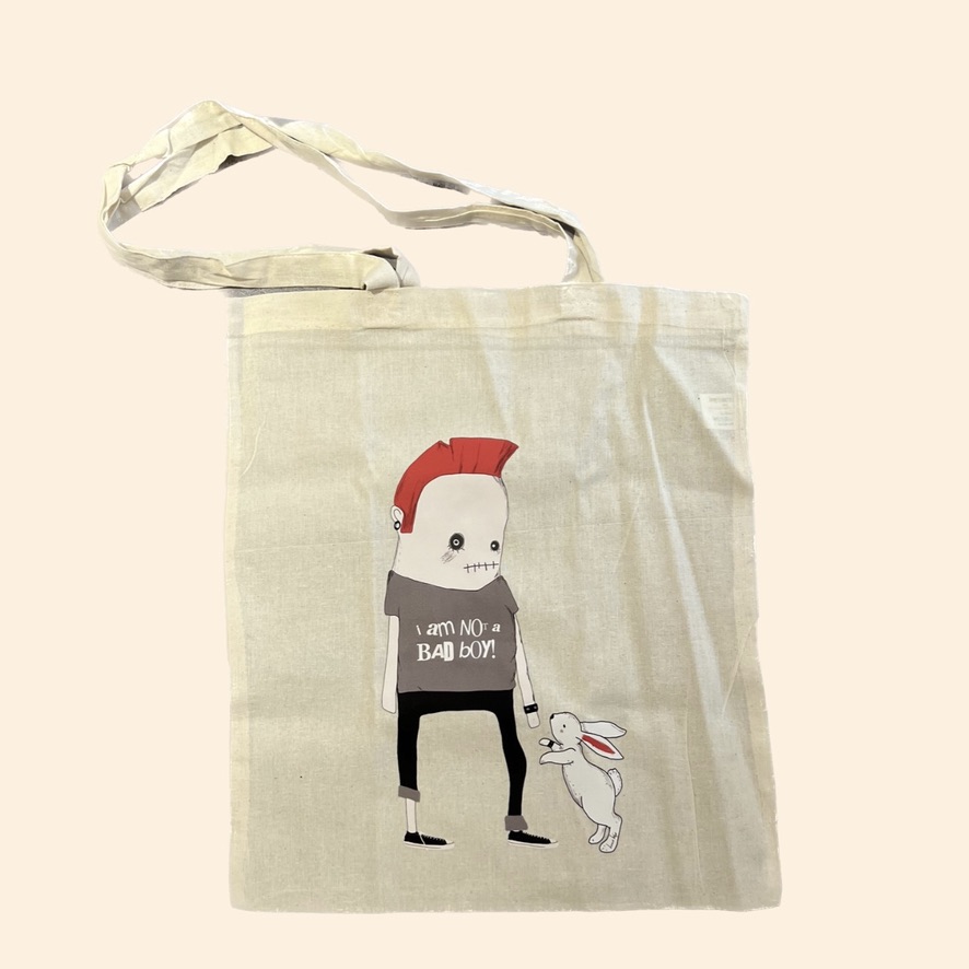 • Saco de pano bege com ilustração colorida de personagem e coelho