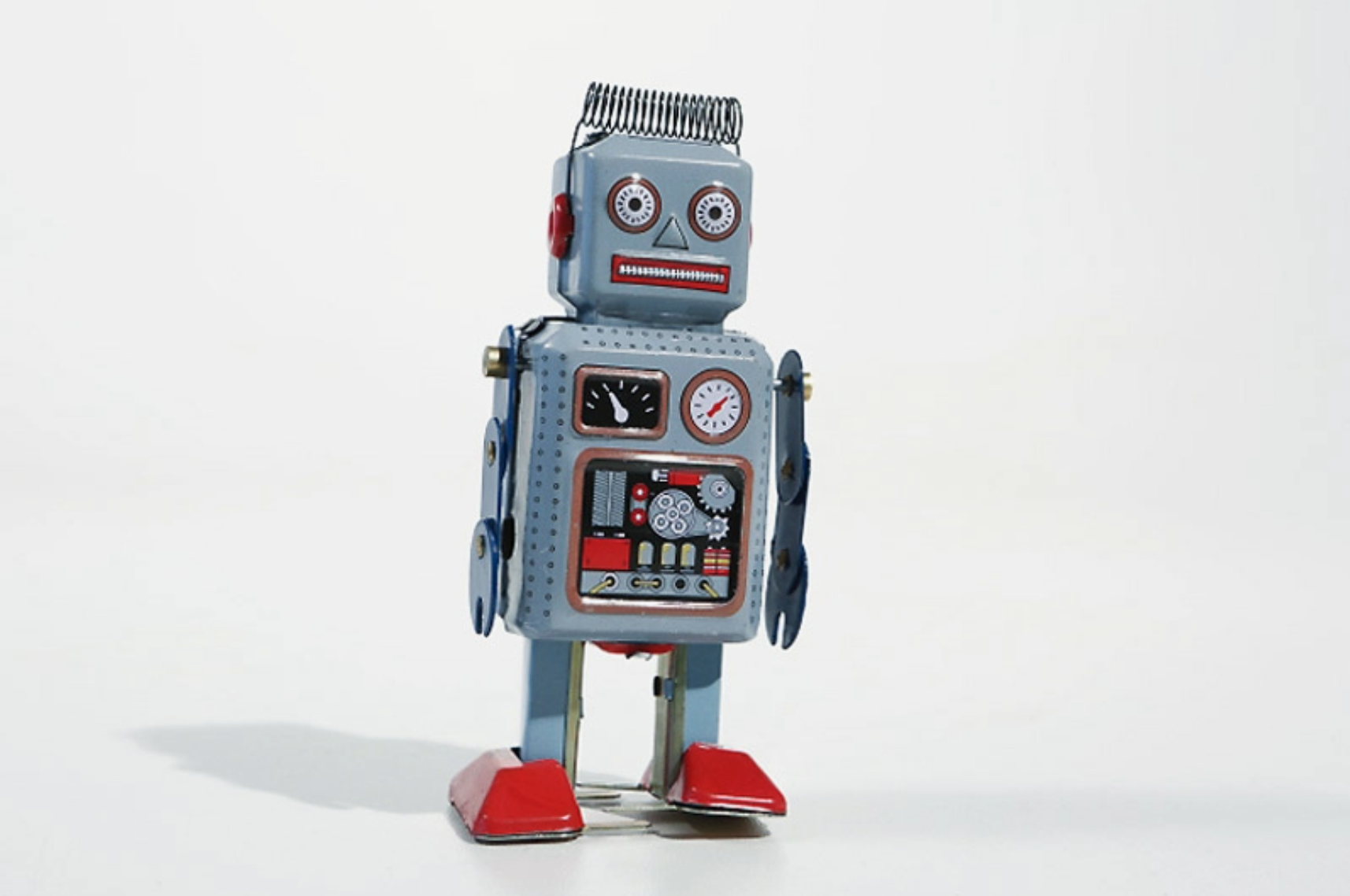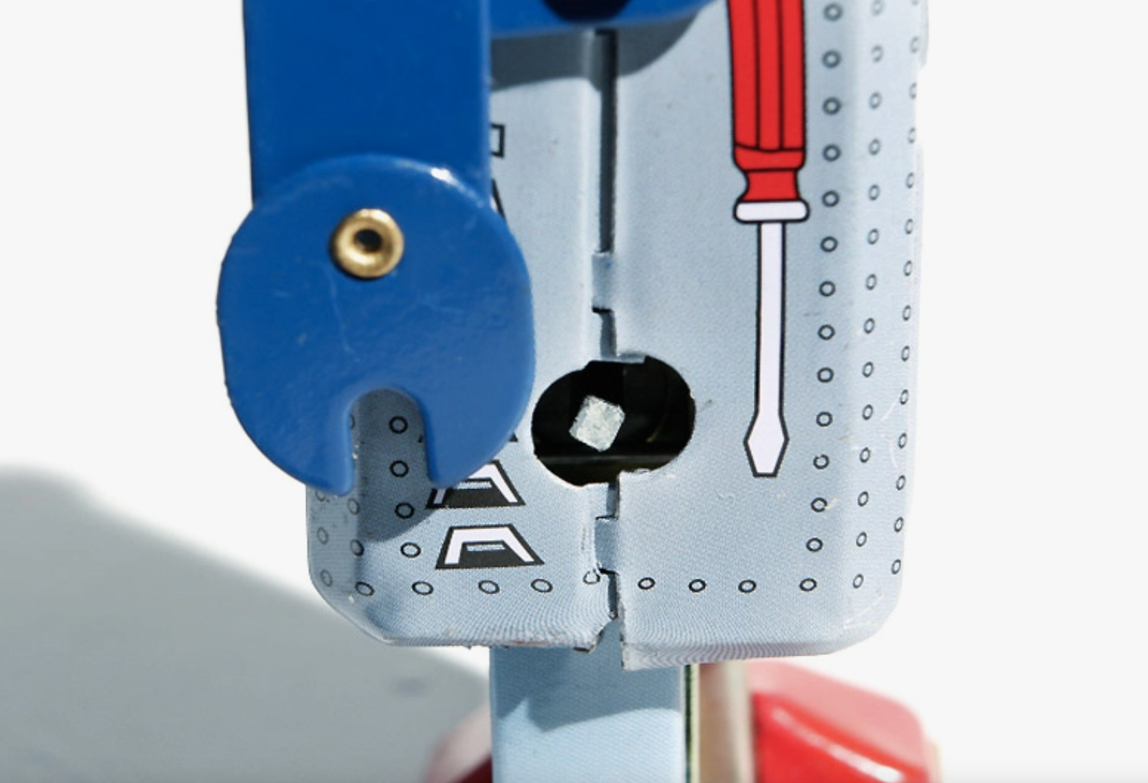 • Robô de metal retro azul e vermelho com detalhes coloridos