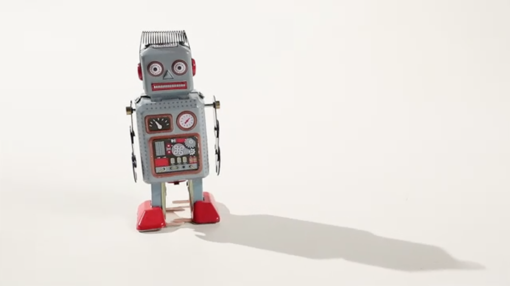 Touly, o pequeno robot de corda com uma expressão facial engraçada e que  balança casualmente os braços para frente e para trás.