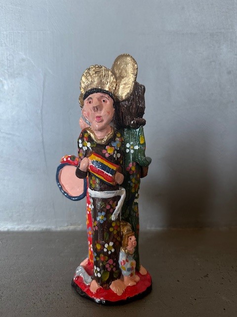 • Estátua colorida de figura humana com roupa florida e chapéu dourado, segurando tambor vermelho, com outra figura pequena ao lado.