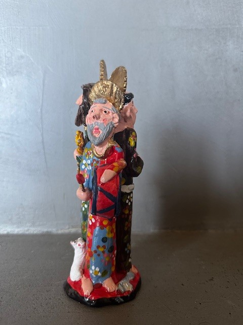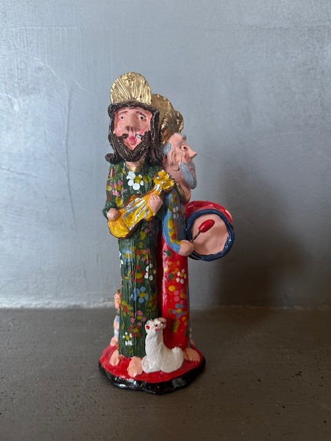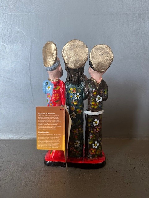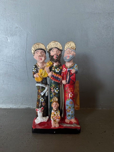 • Figura decorativa colorida de três personagens com halos e as suas figuras menores