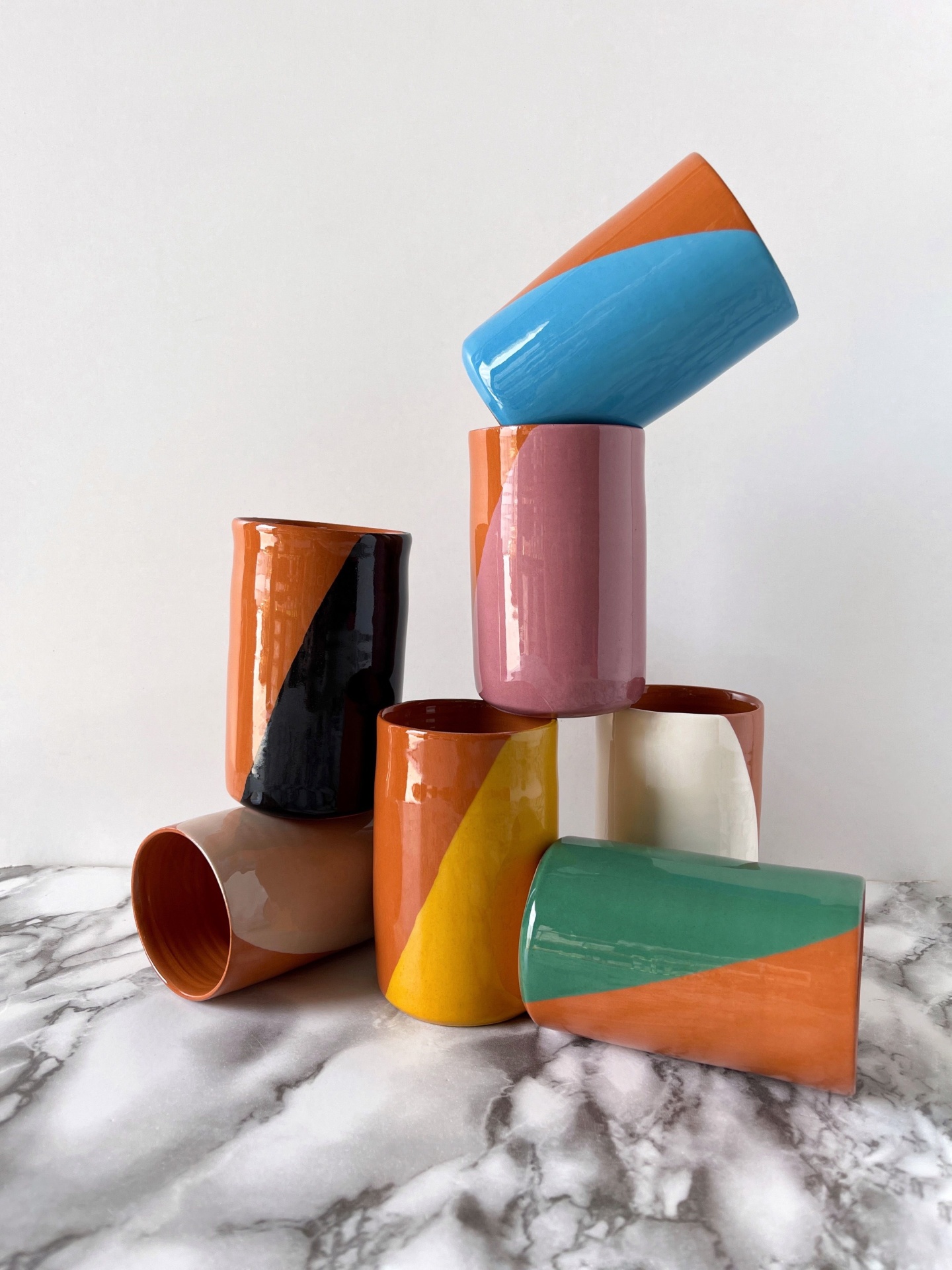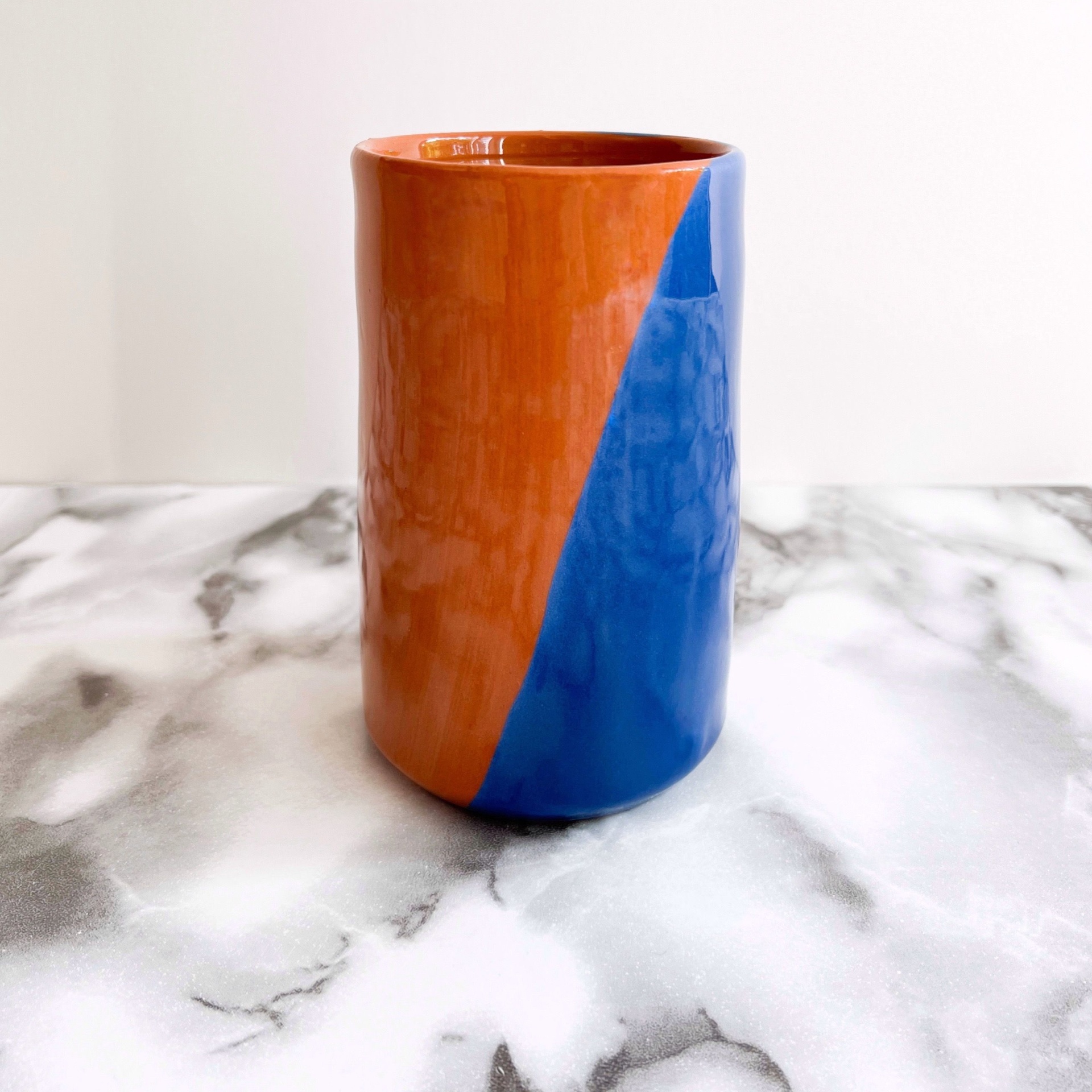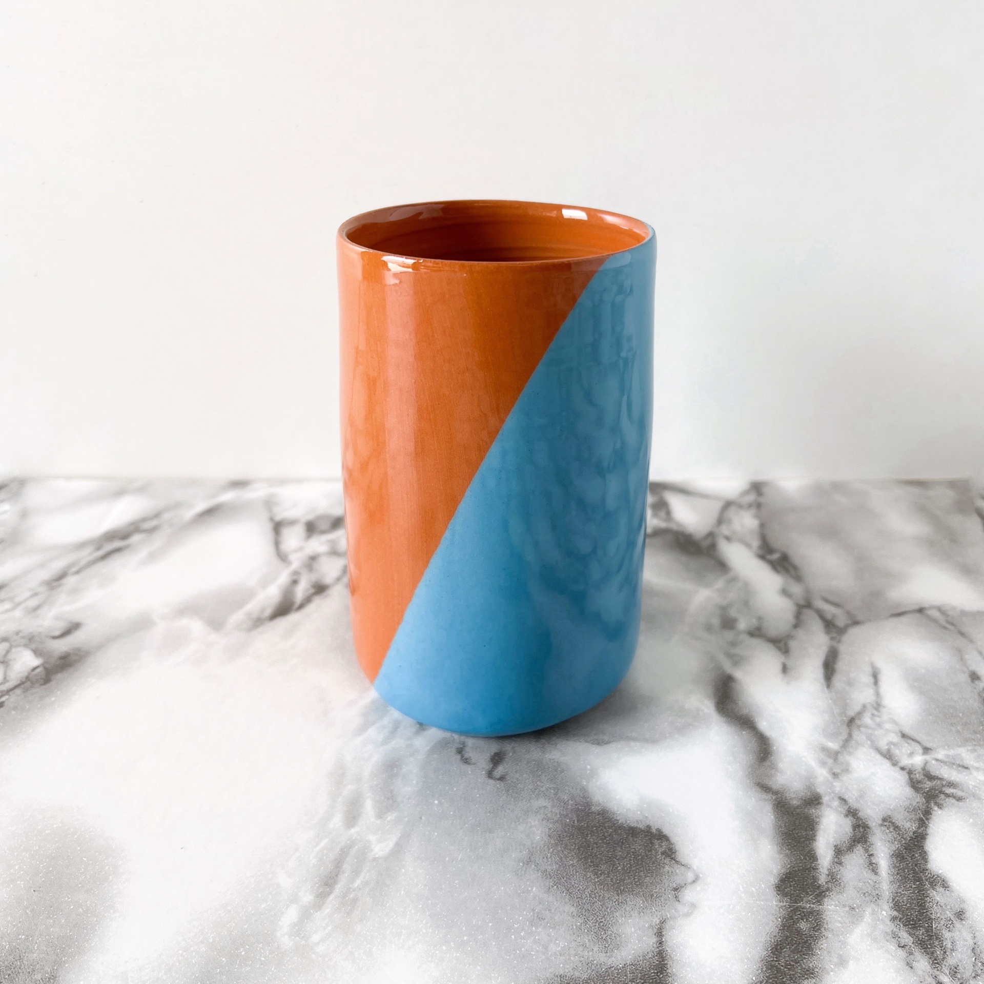 • Copo cerâmico brilhante laranja e azul sobre superfície marmoreada.