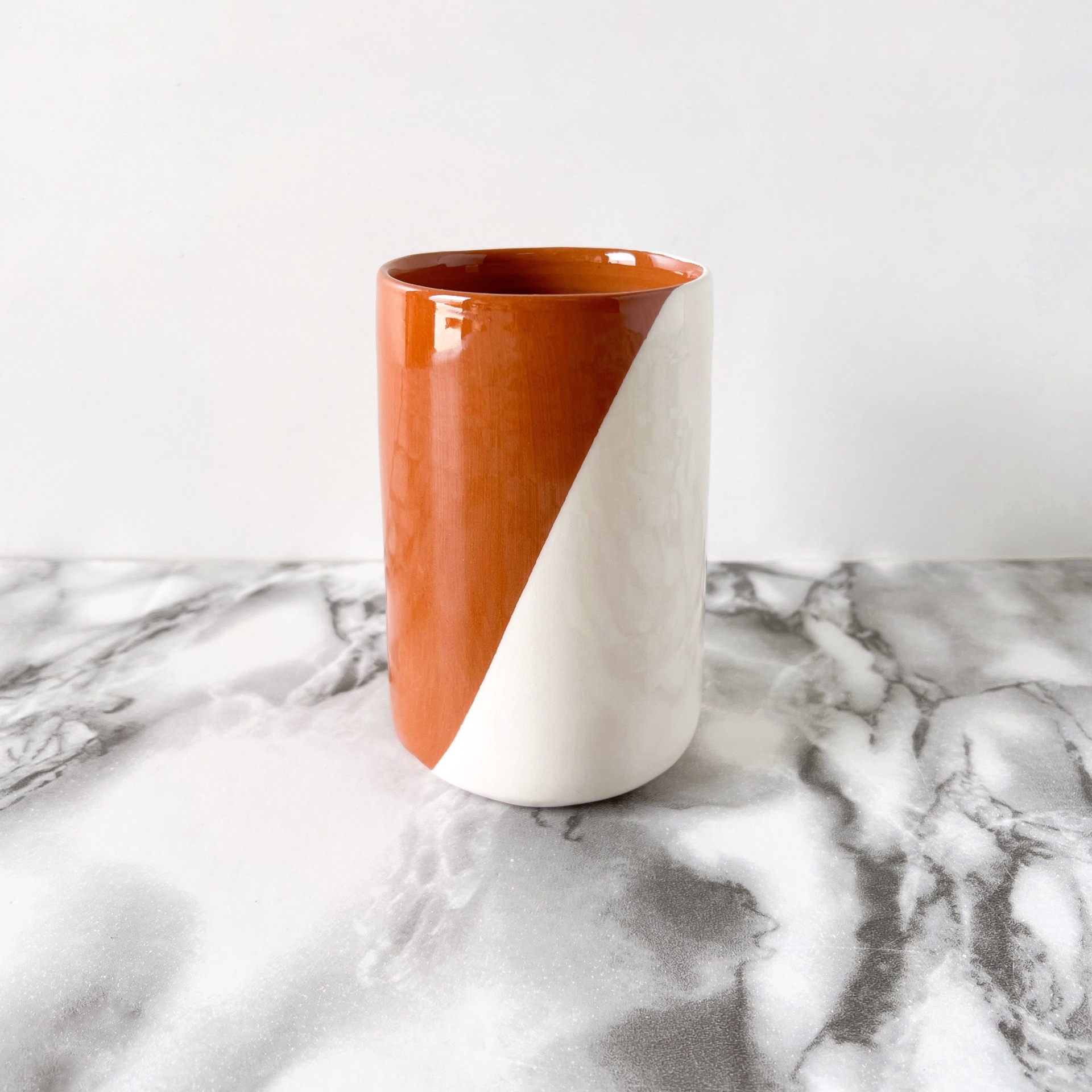 • Copo cerâmico bicolor terracota e branco sobre superfície marmoreada