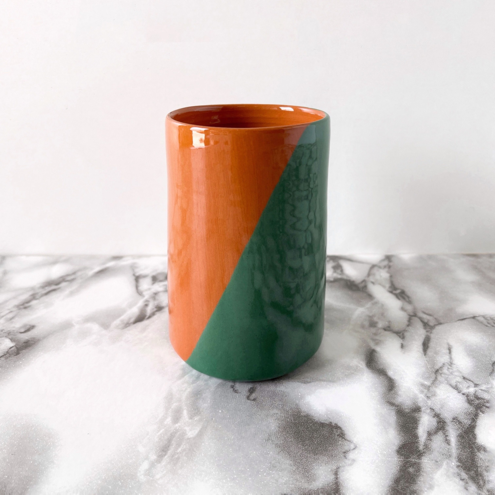 • Vaso cilíndrico em cerâmica laranja e verde escuro