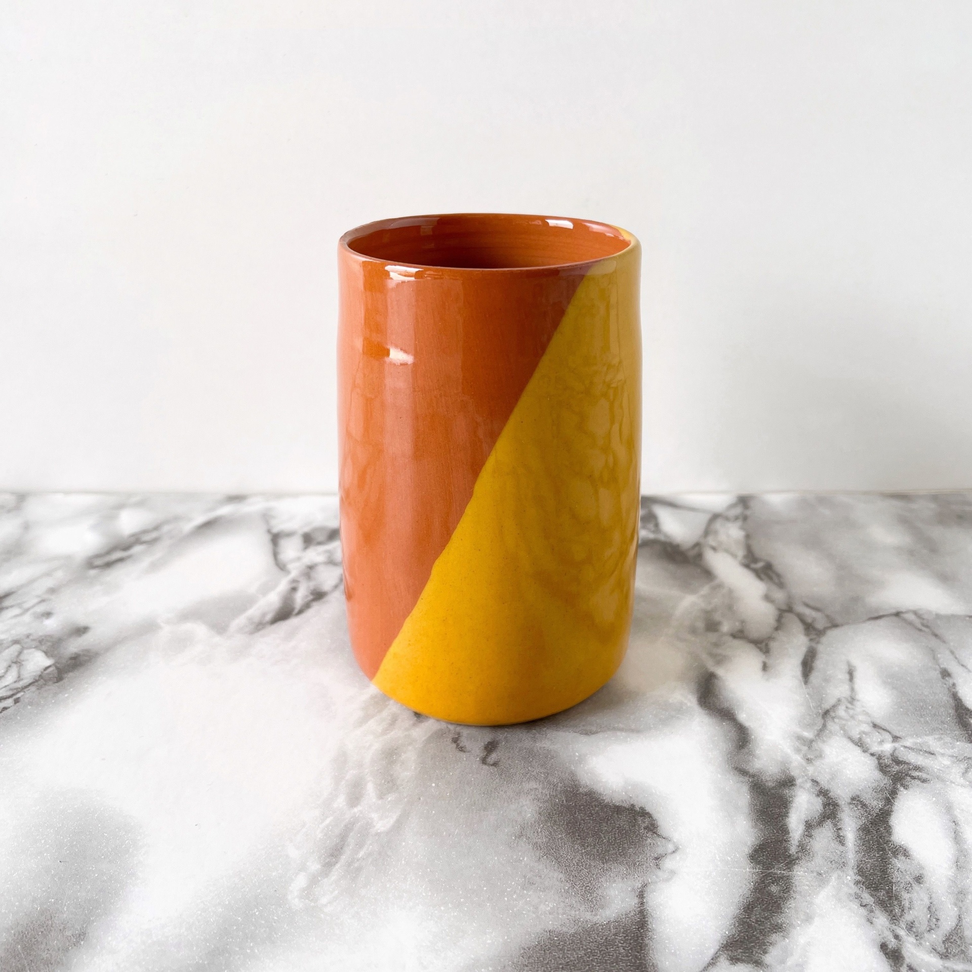• Vaso cilíndrico em cerâmica laranja e amarelo sobre superfície de mármore