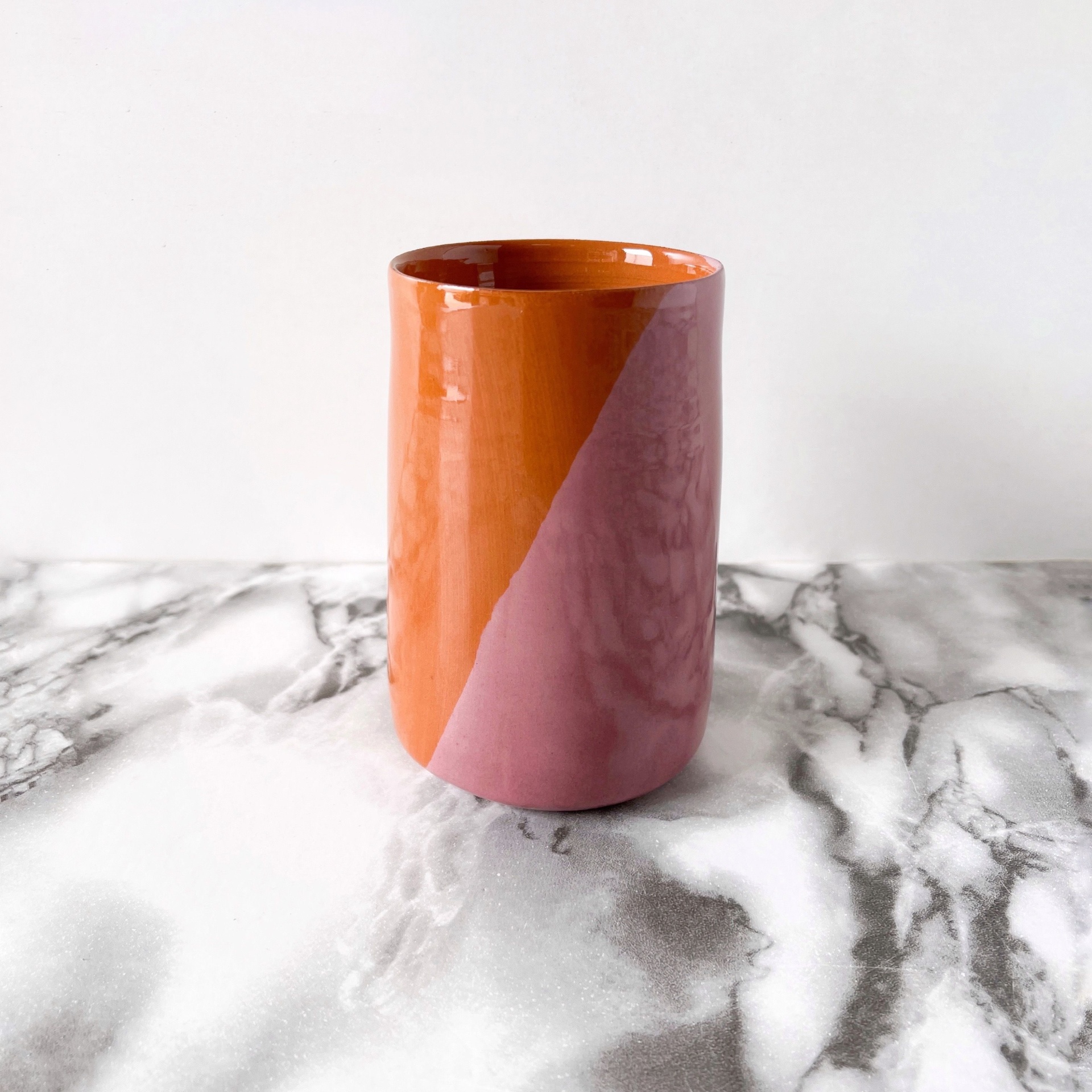 • Copo cerâmico laranja e rosa com superfície de mármore cinza e branco
