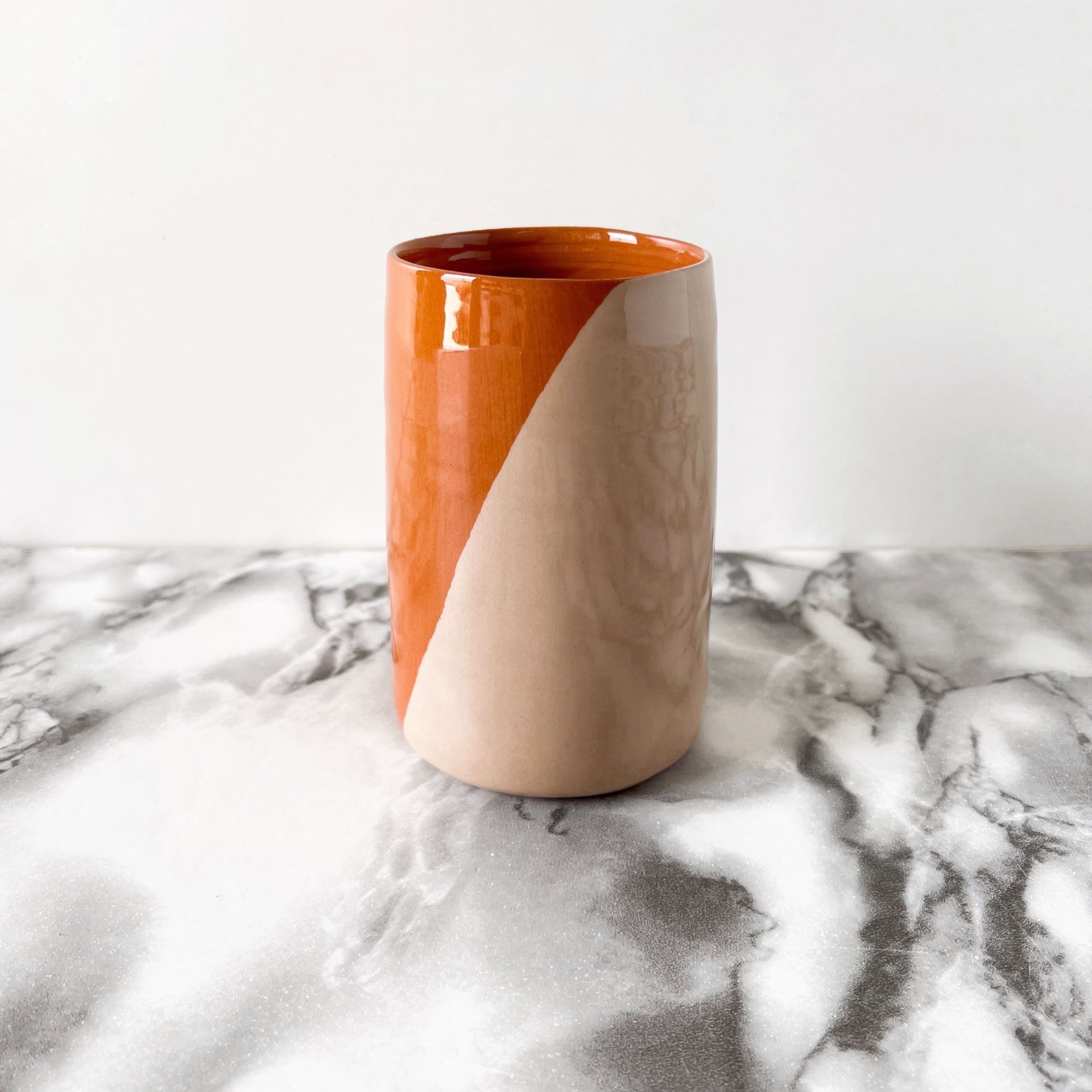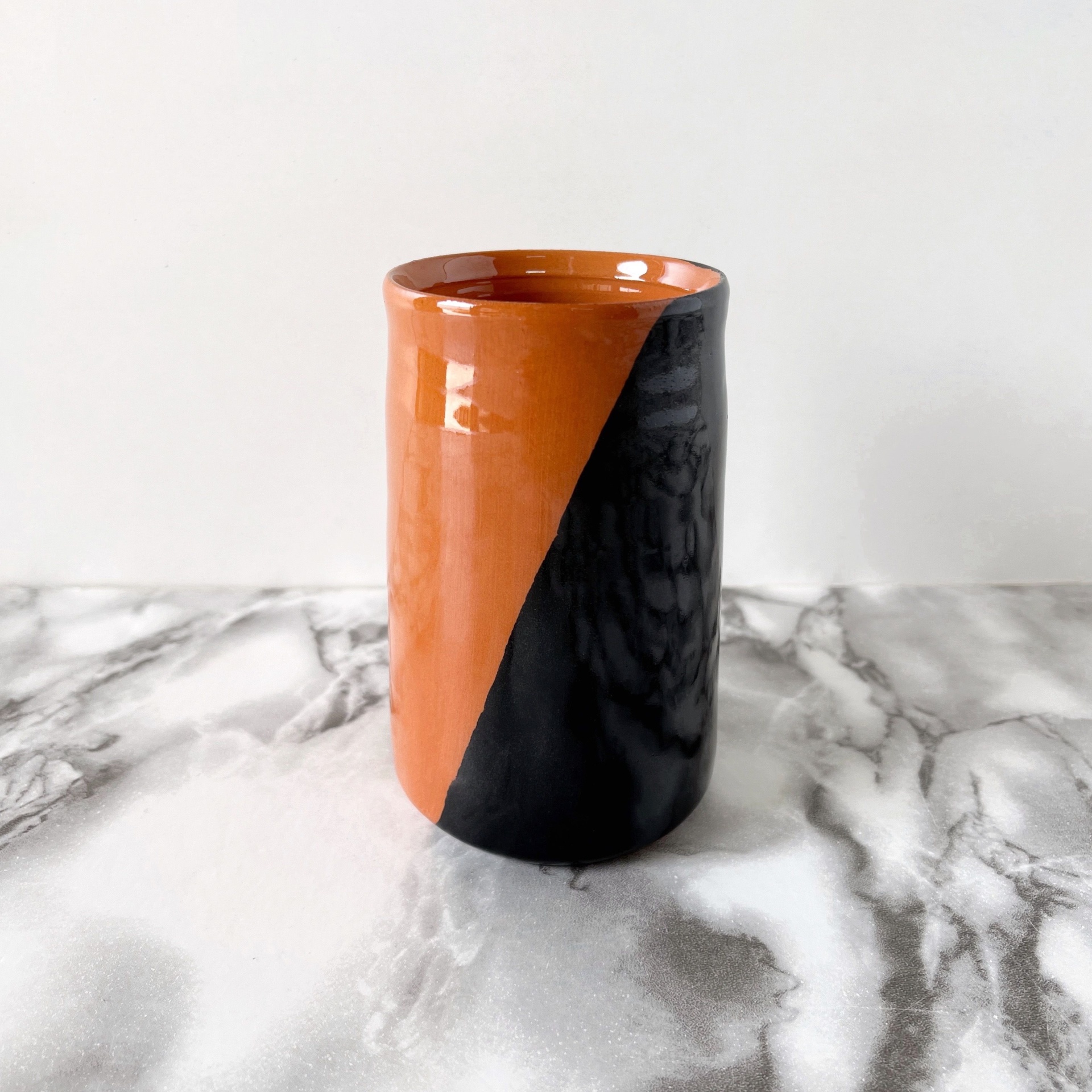 • Vaso cilíndrico cerâmico bicolor laranja e preto sobre mármore